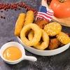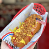 Pain à hot-dog, saucisse grillé, oignons crispy, cheddar, bacon et ketchup.