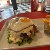 Salade, oignon, steak haché smashé, cheddar, sauce brazil